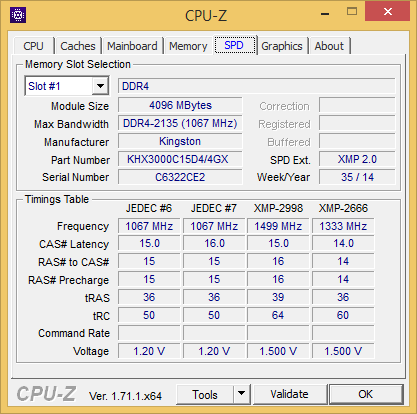 На нашем тестовом стенде с настройками UEFI BIOS по умолчанию память Transcend TS512MLH64V1H завелась в полном соответствии со спецификацией, то есть на частоте 2133 МГц с таймингами 15-15-15-36 и при напряжении питания 1,2 В.