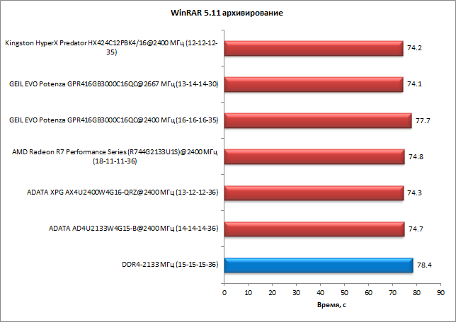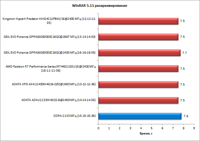 В тесте разархивирования с использованием приложения WinRAR 5.11 разница между худшим и лучшим результатами составила 4%. И как всегда, память Geil Evo Potenza на частоте 2667 МГц демонстрирует результаты, типичные для памяти DDR4-2400, а на частоте 2400 МГц — результаты, типичные для DDR4-2133.