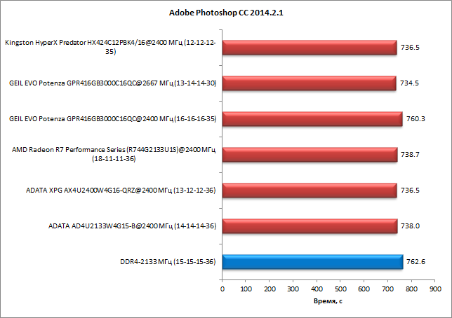 Приложение Adobe Photoshop CC 2014.2.1 оказалось малочувствительным к скорости работы памяти. В нашем тесте разница между худшим и лучшим результатами составила порядка 3,5%. И опять «странная» память Geil Evo Potenza на частоте 2667 МГц работает примерно так же, как любая другая память DDR4-2400, а на частоте 2400 МГц результаты памяти Geil Evo Potenza сопоставимы с результатами DDR4-2133.