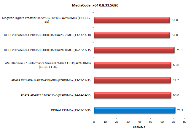 Итак, начнем с теста по транскодированию видео с использованием приложения MediaCoder x64 0.8.33.5680. Как видим, данная задача не очень чувствительна к быстродействию памяти: худший результат отличается от лучшего всего на 6%. Интересно отметить, что память Geil Evo Potenza на частоте 2667 МГц с таймингами 13-14-14-30 демонстрирует такой же результат, что и память Kingston HyperX Predator на частоте 2400 МГц с таймингами 12-12-12-35. А на частоте 2400 МГц (с таймингами 16-16-16-35) память Geil Evo Potenza работает примерно так же, как память DDR4-2133.