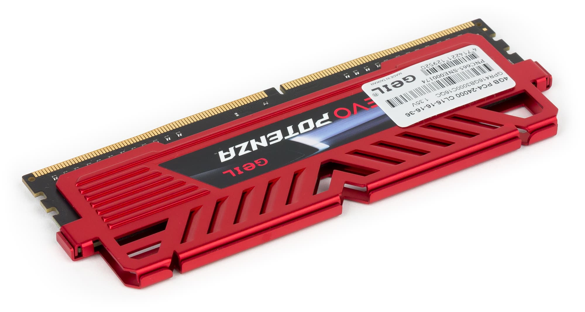 Комплект четырехканальной памяти Geil GPR416GB3000C16QC относится к серии Geil Evo Potenza. Это четыре модуля памяти DDR4-3000 суммарным объемом 16 ГБ (4 × 4 ГБ). Модули памяти оснащены радиаторами охлаждения бордового цвета. Сами модули памяти односторонние, то есть все чипы памяти расположены на них с одной. Вообще, нужно отметить, что радиаторы на памяти внушительно, скажем так, не выглядят. Толщина пластинок, из которых сделан радиатор, составляет менее 1 мм. Высота модуля памяти с радиатором — 47 мм.