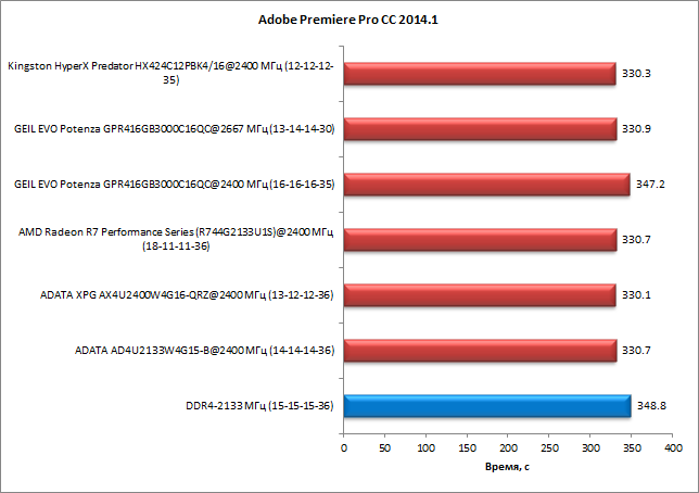 В приложении Adobe Premiere Pro CC 2014.1 получаем аналогичный результат. Разница по времени выполнения теста между памятью DDR4-2133 и DDR4-2400 составляет примерно 5%. И в данном тесте память Geil Evo Potenza на частоте 2667 МГц с таймингами 13-14-14-30 демонстрирует такой же результат, что и любая другая память в режиме DDR4-2400. А на частоте 2400 МГц (с таймингами 16-16-16-35) память Geil Evo Potenza работает примерно так же, как память DDR4-2133.