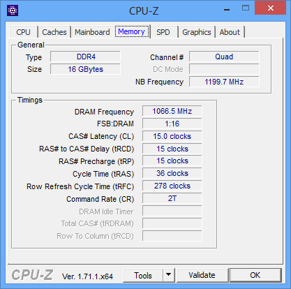 На нашем тестовом стенде с настройками UEFI BIOS по умолчанию память AData AD4U2133W8G15-B завелась без проблем в полном соответствии со спецификацией, то есть на частоте 2133 МГц с таймингами 15-15-15-36 и при напряжении питания 1,2 В.