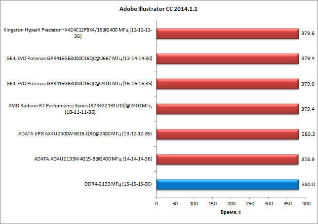 В тесте с использованием приложения Adobe Illustrator CC 2014.1.1 от скорости работы памяти вообще ничего не зависит. Здесь для всех комплектов памяти в различных режимах их работы получаются одинаковые результаты.