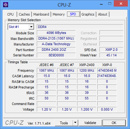 На нашем тестовом стенде с настройками UEFI BIOS по умолчанию память AData XPG AX4U2400W4G16-QRZ завелась на частоте 2133 МГц с таймингами 15-15-15-36 и при напряжении питания 1,2 В.