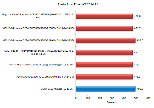 В тесте на основе приложения Adobe After Effects CC 2014.1.1 разница между худшим и лучшим результатами составляет не более 5%. Вновь память Geil Evo Potenza на частоте 2667 МГц с таймингами 13-14-14-30 демонстрирует такой же результат, что и любая другая память в режиме DDR4-2400. А на частоте 2400 МГц (с таймингами 16-16-16-35) память Geil Evo Potenza работает примерно так же, как память DDR4-2133.