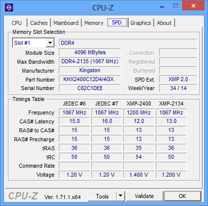 На нашем тестовом стенде с настройками UEFI BIOS по умолчанию память Kingston HyperX Predator HX424C12PBK4/16 завелась на частоте 2133 МГц с таймингами 15-15-15-36 и при напряжении питания 1,2 В.