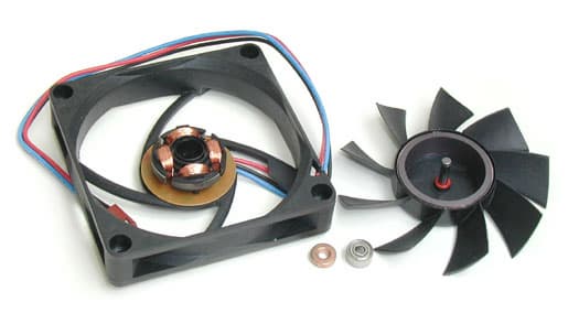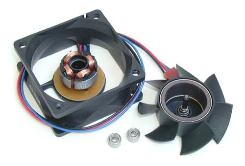 Современные вентиляторы постоянного тока строятся на одно- или двухфазовых вентильных двигателях. Собственно, сами эти двигатели можно условно разделить на две основные составляющие: схему управления и индукторную машину. Индукторная машина повсеместно представляет собой связку ротор-статор, где ротором является кольцевой постоянный магнит, а статором четырехполюсный (гораздо реже шестиполюсный) индуктор.