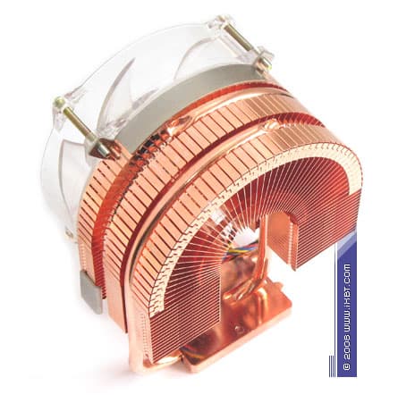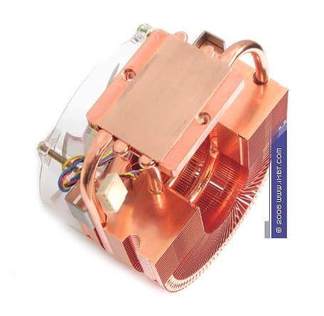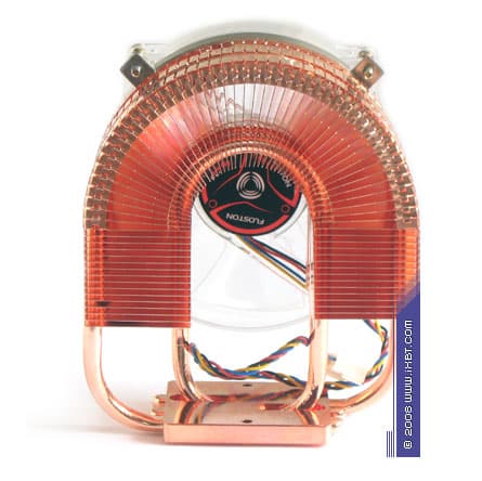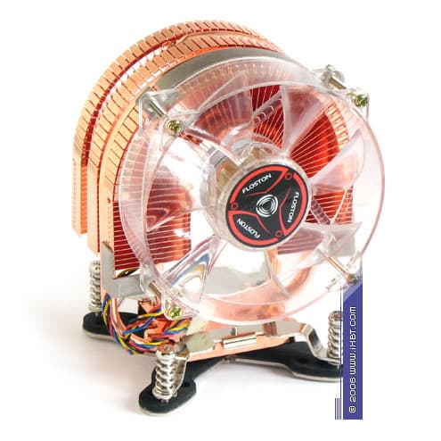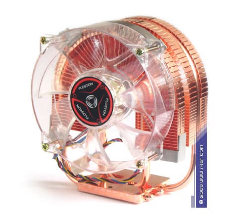 Пожалуй, основным позитивным моментом в имидже Cyclone Rev 2.0 выступает элегантный дизайн его «рабочего тела» — спецы Floston не поскупились на медь и создали вполне солидный технический комплекс, составленный из медного теплосъемника 50х45х6 мм, 4 медных тепловых трубок диаметра 6 мм, индивидуализированного оребрения (эффективные габариты 100х45х75 мм) и симпатичного вентилятора типоразмера 92х92х25 мм (номинальная скорость вращения крыльчатки 2500 об/мин, ШИМ-контроль оборотов).