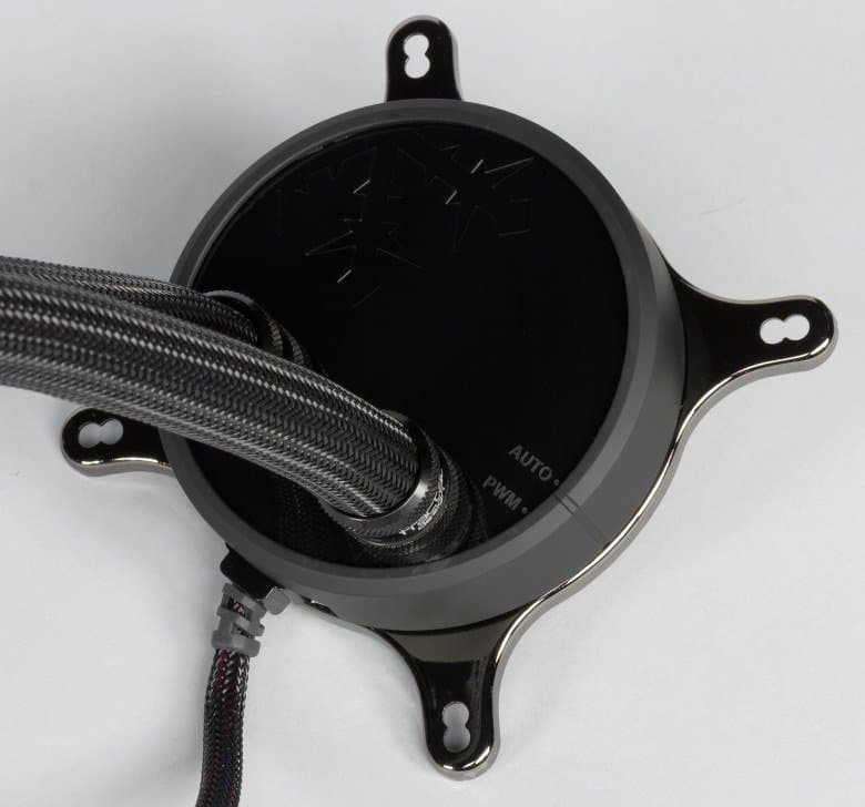 Это очень удобно, так как нет необходимости протягивать кабели от вентиляторов внутри корпуса. Кабель к разъемам для подключения вентиляторов идет от помпы под оплеткой одного из шлангов. На вентиляторы подается питание и сигнал с ШИМ, скорость вращения вентиляторов никак не отслеживается. К разъему на кабеле от помпы подключен датчик вращения самой помпы. В итоге подключение максимально упрощено, так как пользователю достаточно подключить вентиляторы к разъемам на радиаторе, а кабель от помпы к разъему для процессорного охладителя на материнской плате. Оставив переключатель режимов в положении Auto, пользователь сразу и без дополнительной настройки и использования какого-либо ПО получает работающую систему охлаждения с оптимальными, по мнению производителя, параметрами. При необходимости пользователь может вмешиваться в работу системы, выбрав кольцом помпы режим PWM и изменяя скважность управляющих импульсов вручную или с помощью функций BIOS Setup материнской платы или стороннего ПО. Дополнительно можно отсоединить кабели вентиляторов от разъеме на радиаторе и управлять скоростью их вращения отдельно.