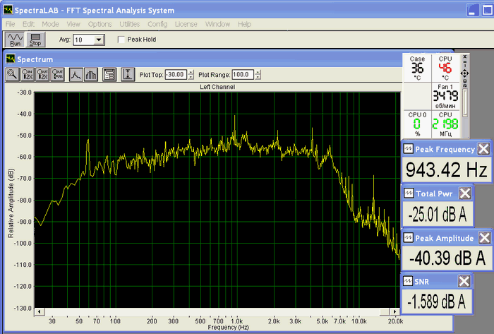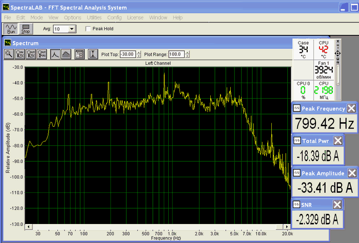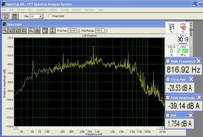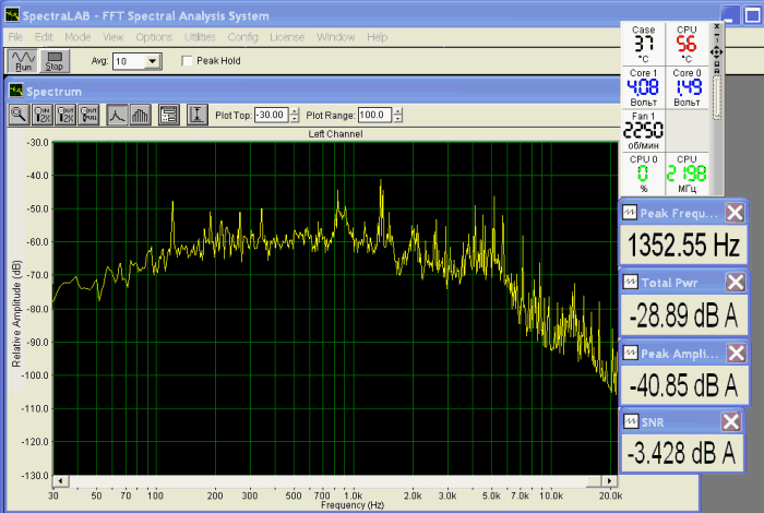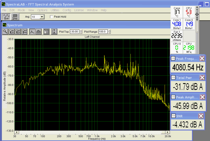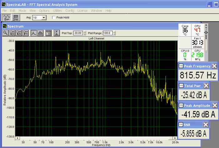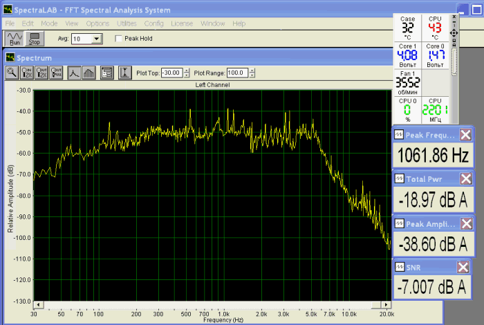 Измерения шума кулеров проводились в соответствии с ранее использованной нами методикой. Измеряемый одним микрофоном относительный уровень звукового давления оцифровывался и обрабатывался в реальном времени в программе SpectraLab (нагрузка процессора SpectraLab’ом во время проведения тестов составляла порядка 50%). Кроме собственно спектров шума, взвешенных по кривой «А» (см. скриншоты ниже), регистрировались относительные значения общей мощности шумового сигнала, которые затем нормировались для сравнения с паспортными значениями при помощи единой для всех поправки. Измеренные нами данные по уровню звукового давления кулеров нельзя в точности сравнивать с «честными» паспортными значениями шума кулеров, указываемых в спецификациях (последние отражают уровень звуковой мощности, а не давления, и измеряются набором микрофонов на расстоянии 1 м от источника сигнала в очень тихой комнате; такие стандартизованные измерения весьма дорогостоящи). Однако по нашей многолетней измерительной практике, если использовать аккуратно подобранную нормировочную поправку, измеренные таким образом значения достаточно хорошо совпадают с паспортными уровнями шума кулеров (например, по линейкам от GlacialTech) и винчестеров разных производителей. Поэтому для экспресс-оценки шумности кулеров наша методика дает вполне уверенные и разумные результаты. Кроме того, по спектрам шума можно оценить, какие гармонические и спектральные компоненты наиболее существенны в шуме той или иной модели.