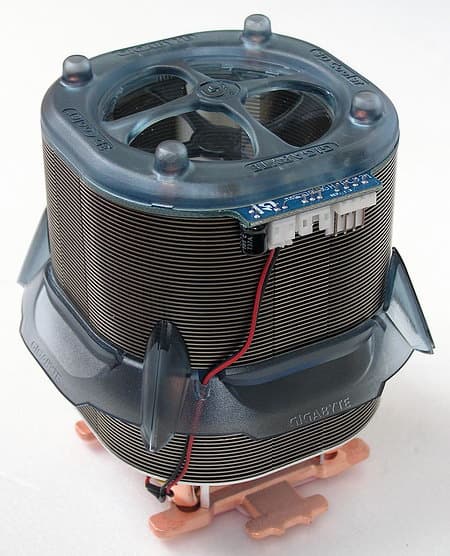 Первый кулер от компании Gigabyte Technologies, более известной своими материнскими платами и видеокартами, появился на рынке не так давно. Первенец 3D-Cooler-PRO_GH-PCU21-VG оставил сложное впечатление, граничащее с недоумением, усугубленное нешуточной, почти сорокадолларовой ценой: несмотря на медное основание и использование тепловых трубок для соединения основания с алюминиевыми ребрами радиатора, теплоотдача кулера была не очень высокой, и с охлаждением самых современных настольных процессоров он справлялся лишь тогда, когда его вентилятор, выполненный в виде цилиндрической турбины, вращался на максимальных оборотах, издавая при этом невообразимый рев и шум. Следом за ним компания выпустила модификацию этого кулера, использующую медные пластины радиатора вместо алюминиевых Gigabyte_3D_Cooler-Ultra. Теплоотдача кулера заметно улучшилась и стало возможным использовать его в тихом режиме работы, почти не теряя при этом в охлаждении. Иногда этому «медняку» даже удавалось приблизиться к знаменитому кулеру Zalman CNPS7000A-Cu.