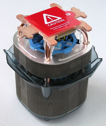 Чтобы скомпенсировать эти «потери» радиатор наглухо закрыли сверху прозрачной крышкой (на фото выше), поэтому поступающий сверху воздух вынужден всасываться сквозь верхние ребра, дополнительно охлаждая кулер. Создается даже ощущение, что «судороги дизайнерской мысли» в последний момент нашли дешёво-сердитое решение в виде это крышечки, чтобы вывести имеющийся конструктив из аутсайдеров.
