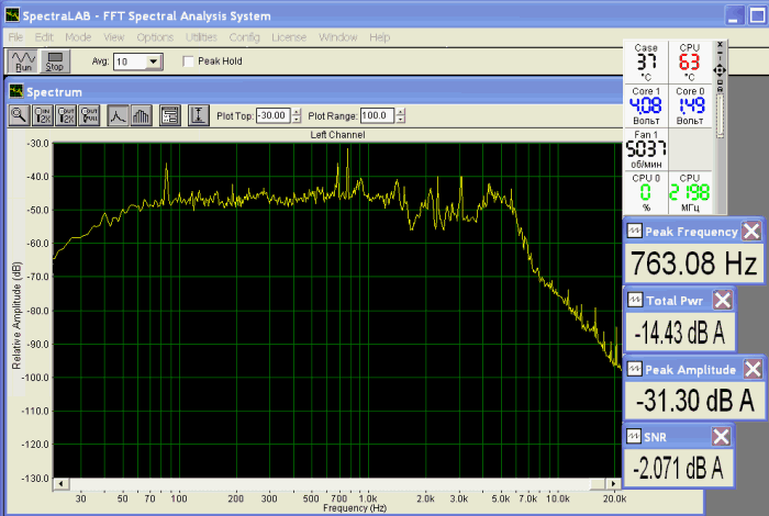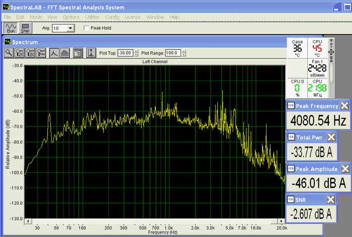 На рисунках представлен взвешенный по кривой А спектр шума системы с открытой и закрытой крышкой корпуса (т.к. за счет внутрикорпусных резонансов в закрытом корпусе низкочастотные составляющие спектра).