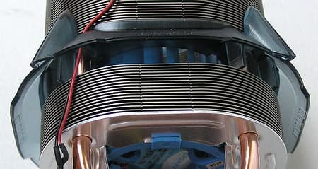 Он призван всасывать воздушный поток с двух торцов радиатора и затем прокачивать его сквозь пластины радиатора, обдувая на выходе близлежащие компоненты платы. Однако за счет того, что высота кулера возросла, воздух теперь выдувается не сквозь все ребра, а только через нижние из них (плюс часть воздуха свободно выдувается наружу, отражаясь от «жабо»).