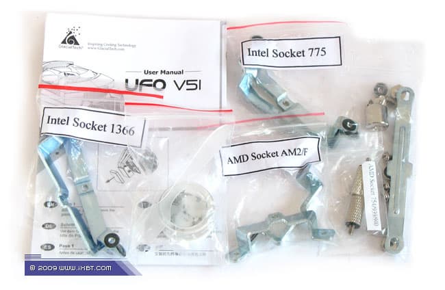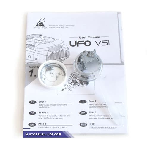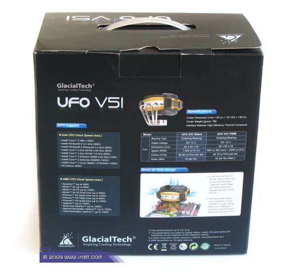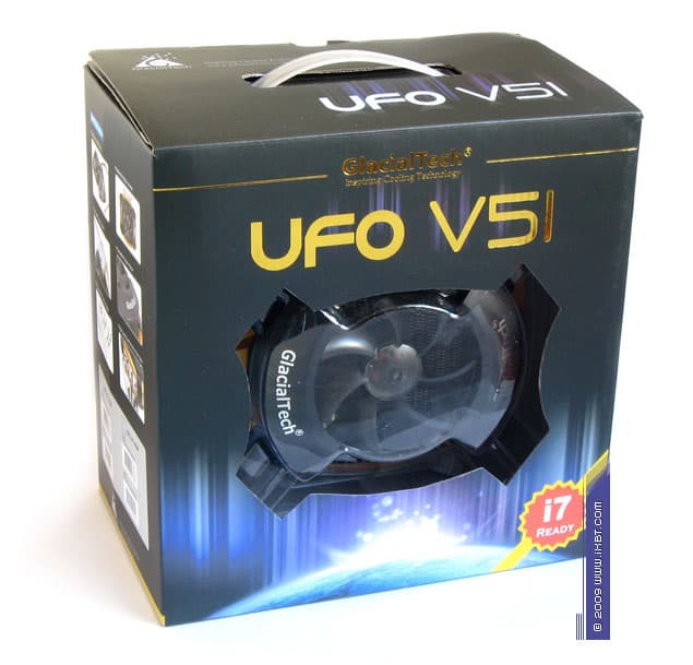 Как и подобает продукту высокого класса, UFO V51 поставляется в большой аккуратной упаковке, снабженной красочным описанием внутреннего содержимого с листингом конструктивных «фич» и технических характеристик, а также подборкой информативных фотографий. Сквозь декоративное «окошко» проглядывает и сам кулер, облаченный в пластиковый блистер.