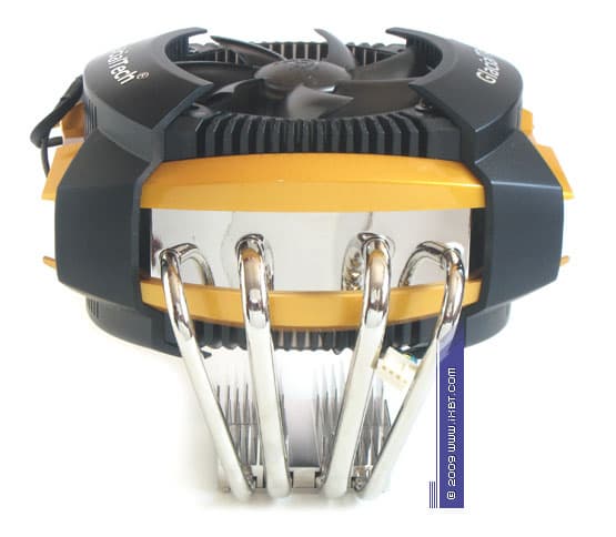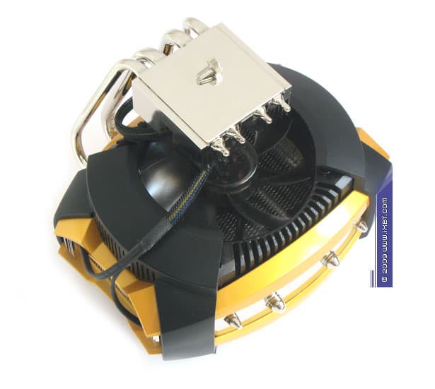 Опять же, явно не лишним в имидже UFO V51 становится вспомогательный алюминиевый радиатор, зафиксированный на теплосъемнике он позволяет разгрузить интенсивно прогреваемые участки тепловых трубок (с попутным увеличением эффективной площади контакта в паре «теплосъемник-трубки»), и тем самым, вносит довольно существенный вклад в дело минимизации полного термического сопротивления кулера. Почти что образцовый порядок соблюдается и в плане обеспечения надежного «сцепления» элементов «рабочего тела»: термоконтакт по всем критически важным сопряжениям «теплосъемник-трубки» и «трубки-оребрение» осуществлен как положено пайкой.
