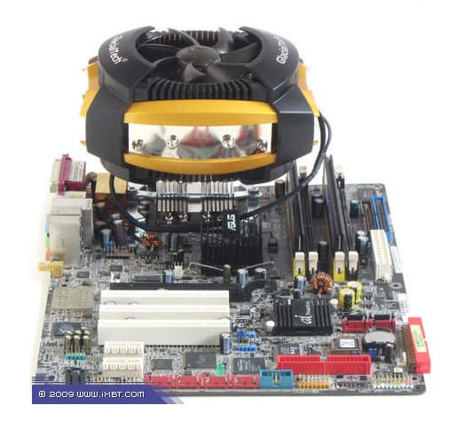 Между тем, даже в самом строгом рассмотрении ставить в укор нашему подопытному его усложненный крепеж не очень-то справедливо. Все-таки, если принять во внимание немаленький вес, который составляет порядка 800 г, нетрудно сообразить, что типовые варианты крепежа замки-кембрики под LGA775 или двухконтактные клипсы под Socket AM2, здесь малоприменимы. Такова уж природа крупногабаритных радиаторных конструкций этого, как говорится, не отнять, ни прибавить. А вот специализированный крепеж, напротив, оказывается на своем исконном месте он гарантирует должную мультплатформенную адаптацию, попутно обеспечивая плотную посадку кулера с минимизированным контактным термическим сопротивлением в паре процессор-теплосъемник. И, по факту, засчитывается в имиджевых рамках UFO V51 больше в плюс, чем в минус.