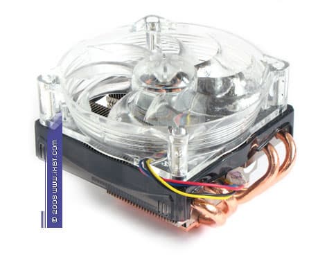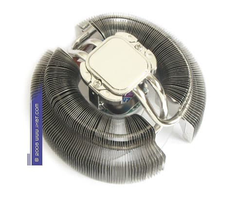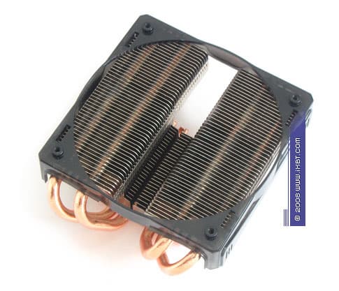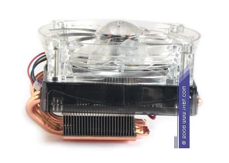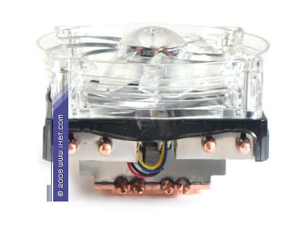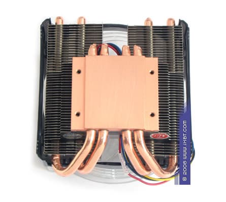 На общем модельном фоне он действительно выделяется весьма своеобразной и эстетически обогащенной внешностью — помимо солидного цельномедного конструктива, составленного комбинацией из теплосъемника 40 ×35 × 5 мм, двух тепловых трубок диаметра 6 мм и двух секций радиального оребрения (эффективные размеры 122 ×50 мм), в техническом активе нашего подопытного также присутствует яркая финишная обработка (никелировка всех функциональных поверхностей) и симпатичный вентилятор с открытой крыльчаткой (типоразмер 110 × 110 ×25 мм), который приправлен традиционными для моддинга голубыми светодиодами.