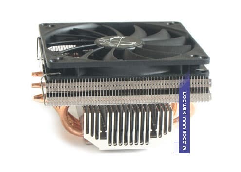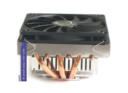 В рамках своего компактного конструктива (общие габариты 112 ×108 ×75 мм) наш подопытный располагает весьма серьезным техническим комплексом, составленным из медного теплосъемника 63 ×48 ×5 мм (подошва 37 ×38 мм), 4 медных тепловых трубок диаметра 6 мм и комбинированного алюминиевого оребрения (часть пластин «интегрированы» в теплосъемник), который дополняется симпатичным вентилятором типоразмера 92 ×92 ×25 мм (номинальная скорость вращения крыльчатки 2800 об/мин, ШИМ-контроль).