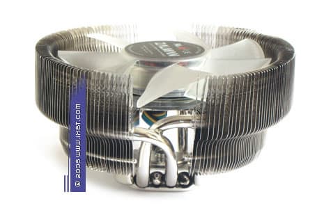 CNPS8700 NT не лишен изюминки и во внутреннем содержании — главной особенностью его «рабочего тела» становится насыщенное двухсекционное оребрение (86 пластин в каждой секции) с чрезвычайно развитой, по меркам компактных радиаторов, поверхностью теплообмена (общая площадь здесь достигает почти рекордной величины 3300 см2). Неплохое впечатление производит также набортный вентилятор, обладающий сбалансированным параметрическим комплексом — и в аэродинамическом оформлении (где следует отметить оптимизированную крыльчатку), и в электромеханике (где выявляется аккуратная электрическая обвязка мотора вкупе с двойным подшипником качения добротного качества), он старается соблюсти правила технического этикета на предмет соответствия хай-эндовому классу.
