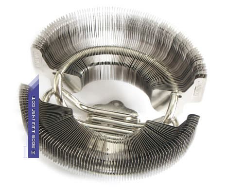 Между тем, конфигурационный портрет нашего «индивидуалиста» все-таки не лишен пары мелких, но весьма досадных огрехов. Прежде всего, неказистым выглядит уплотненное размещение пластин в секциях даже на внешнем контуре оребрения средний шаг составляет не более 2 мм, а внутри «чаши» (непосредственно под «рабочим полем» вентилятора) он и вовсе сужается до 0,5 мм. Как ни крути, такая «сутолока» серьезно затрудняет эффективный продув радиатора и фактически нивелирует преимущества функционального взаимодействия открытого вентилятора с оребренной «чашей». Другой греховный момент заключается в неоптимальном «распределении» трубок их сопряжения с оребрением поставлены очень близко к вентилятору, при этом «нижняя» кромка пластин сильно удалена от точек термоконтакта и в теплообменных процессах практически не участвует. Сказать по правде, от спецов Zalman мы ожидали более трепетного отношения к термическим деталям как-то не по чину им допускать такие несуразицы!