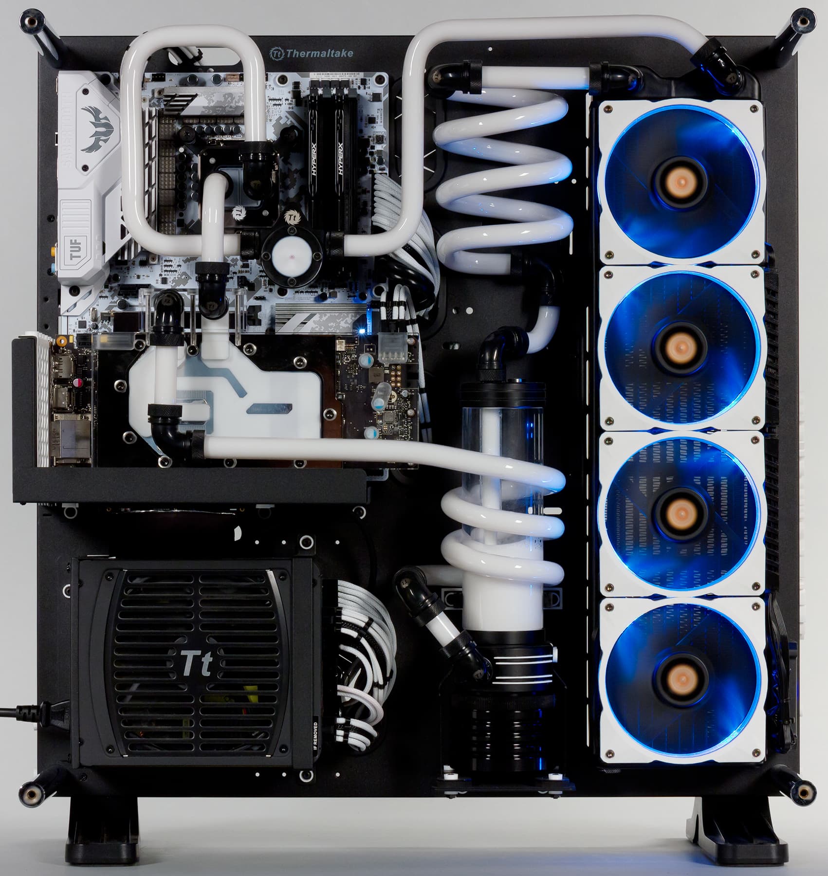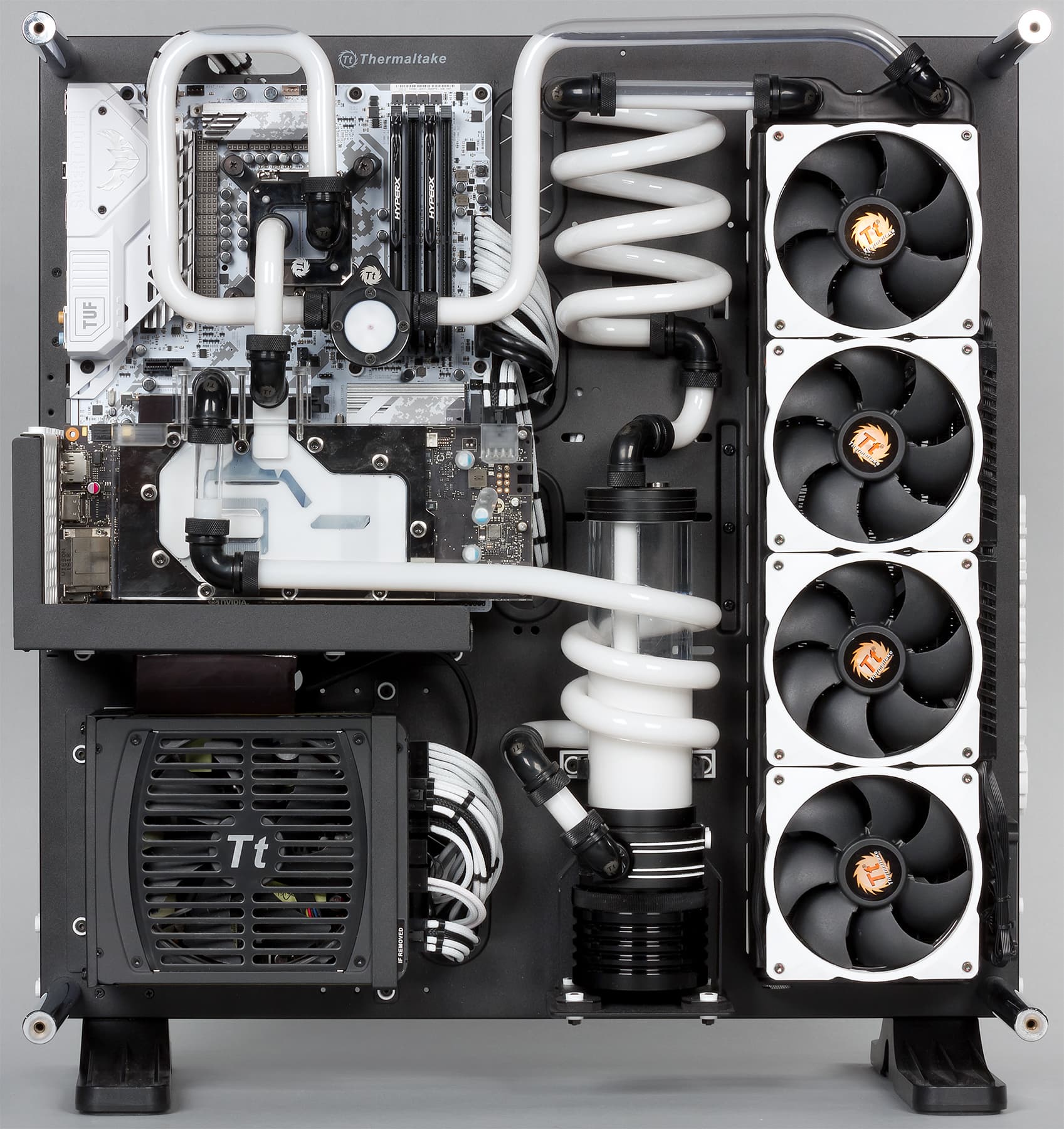Доминирующими в дизайне этого компьютера являются два цвета: черный и белый. Сам корпус Thermaltake Core P5 претерпел, конечно же, моддинговые изменения: на стекле появились сделанные вручную наклейки, а на переднем торце корпуса — трехмерная надпись Thermaltake. Но это далеко не всё. В корпусе используется очень много деталей, которые специально изготовлялись для данного проекта.
