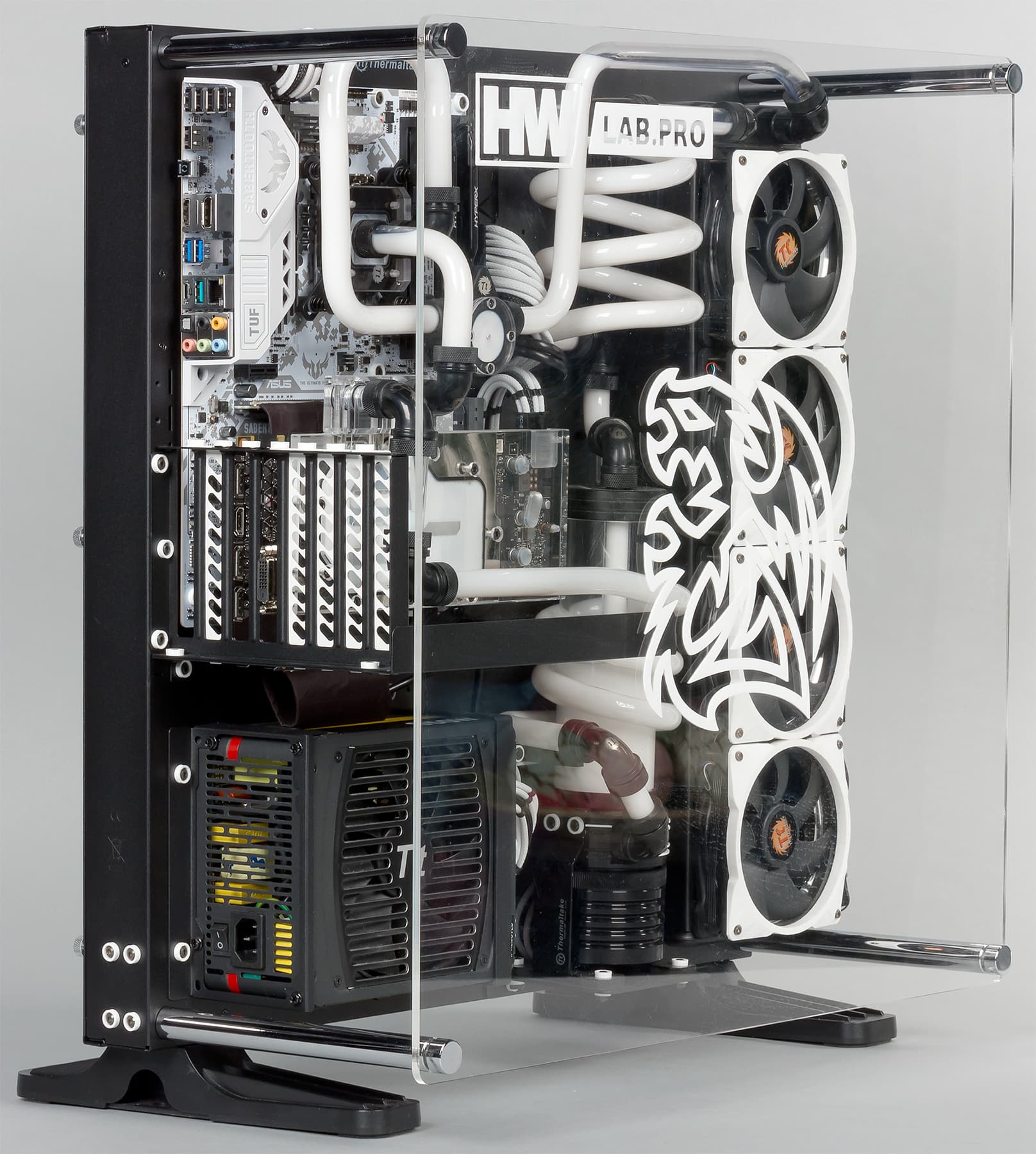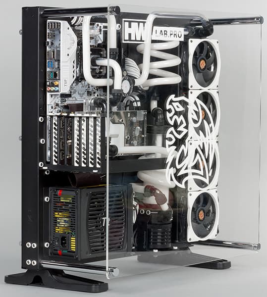 Однако шутки в сторону. Собран компьютер компании HWLab.pro на базе хорошо известного корпуса Thermaltake Core P5. Этот корпус идеально подходит для таких эксклюзивных ПК, которые можно назвать воплощением высокой моды.