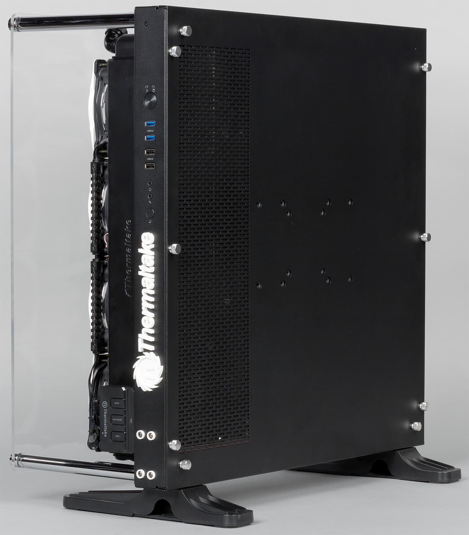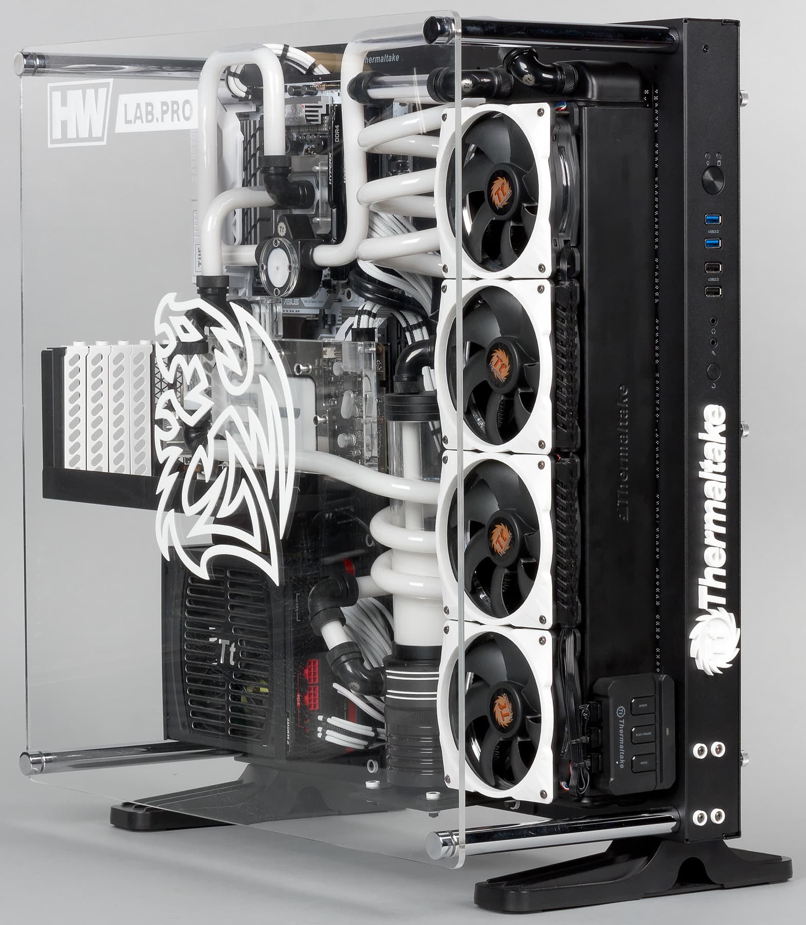 Компьютер, о котором пойдет речь в этой статье, настолько необычен и эксклюзивен, что не имеет даже названия. Этот компьютер был собран компанией HWLab.pro по заказу Thermaltake специально для прошедшей выставки Игромир и демонстрировался на стенде Thermaltake. Задача проекта заключалась в том, чтобы наглядно продемонстрировать новые решения Thermaltake в системах водяного охлаждения. У нас появилась возможность познакомиться с этим необычным ПК, существующим в единственном экземпляре, поближе, и для начала предлагаем посмотреть наш видеообзор игрового компьютера компании HWLab.pro:
