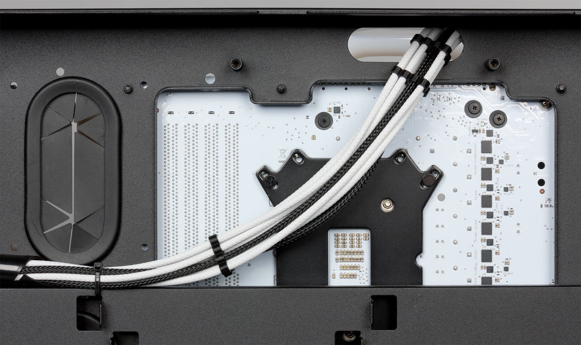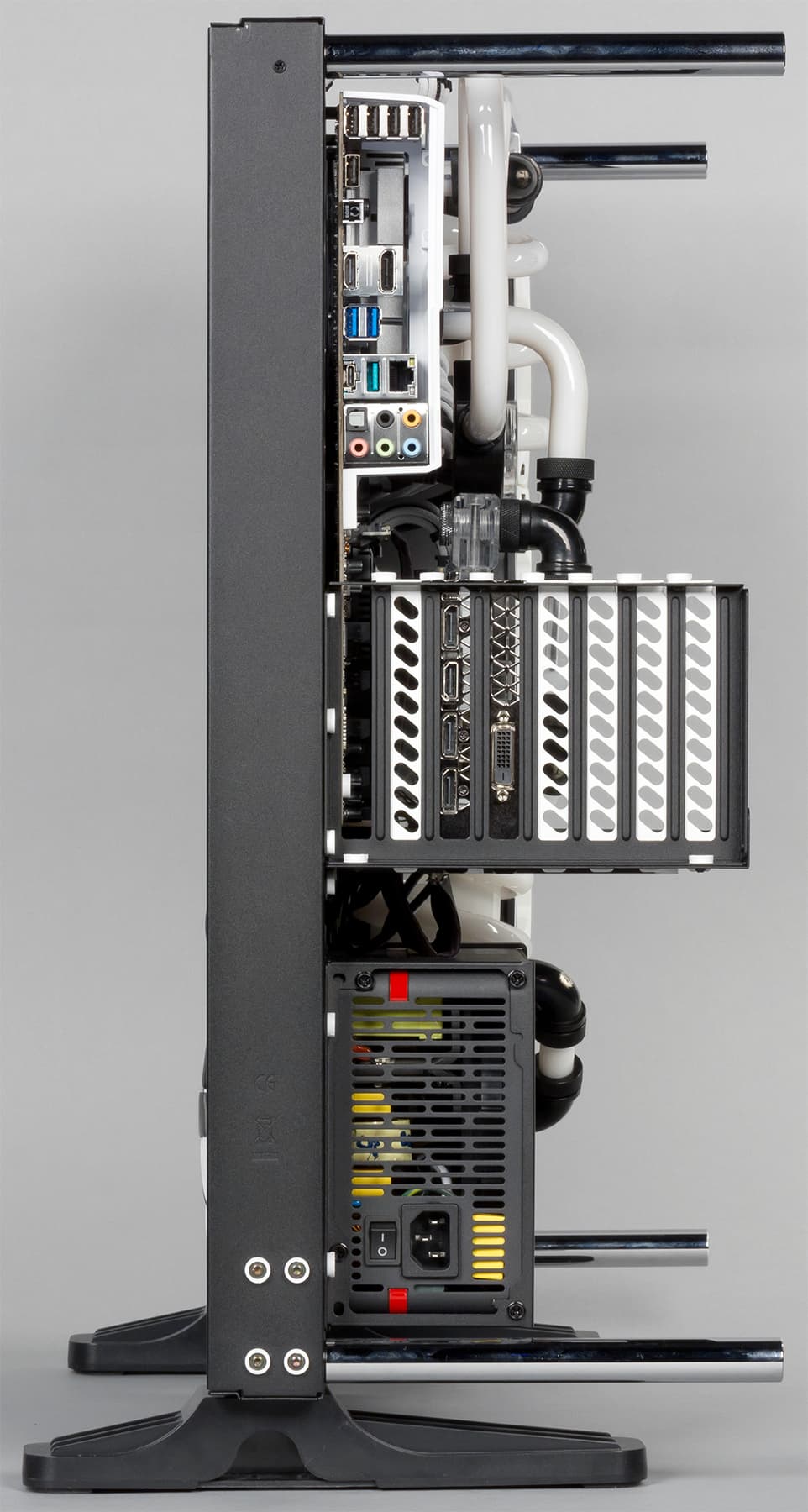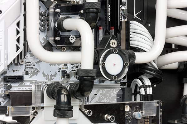 Есть в дизайне рассматриваемого компьютера и различные декоративные элементы. К примеру, черная помпа украшена белыми пластиковыми ободками. Для всех винтиков, с помощью которых крепятся материнская плата, блок питания, заглушки в корзине для установки плат расширения, используются специальные пластиковые шайбы белого цвета. Кстати, эти заглушки также заменены с черных на белые.
