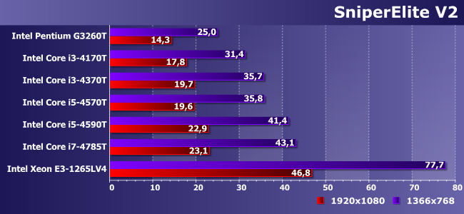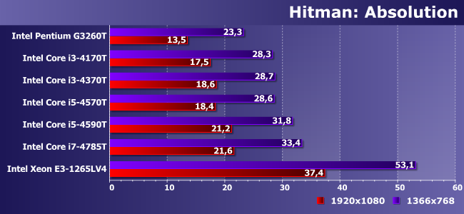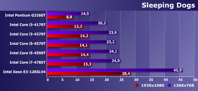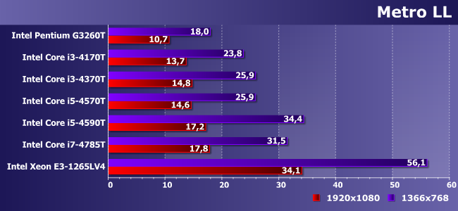 Игра сильно зависит от процессора, но все взятые нами Haswell «уперлись» в собственные видеоядра. Пусть и на приличном уровне — можно и немного качество картинки подкрутить. Ну а на E3-1265LV4 (или замедленном до такого состояния одном из настольных Broadwell-C) того «запаса» стало в полтора раза больше :)