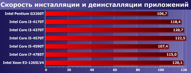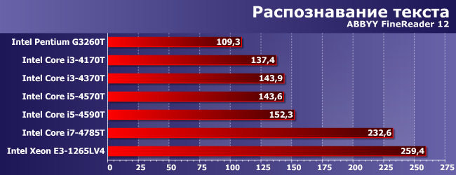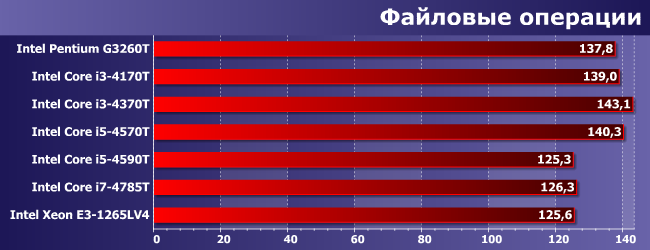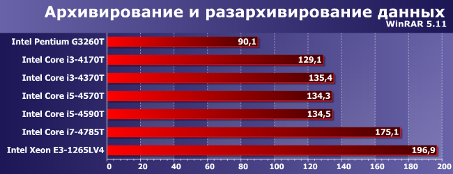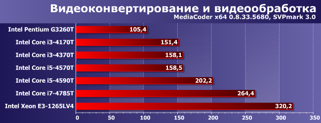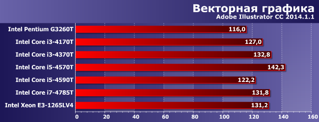 Очевидный аутсайдер Pentium, поскольку у него и GPU слабый, и ядер мало, и поддержка расширенного набора SIMD-инструкций ограниченная. У прочих дела обстоят получше, но вот тут уже разница между двух- и четырехъядерными Core одного поколения невелика. Хотя, конечно, с какой стороны посмотреть — все-таки у i5-4590T и выше даже максимальные частоты в режиме Turbo Boost невелики, а старшим двухъядерникам они как минимум не проигрывают. Но выиграть весомо в очередной раз может только Broadwell.