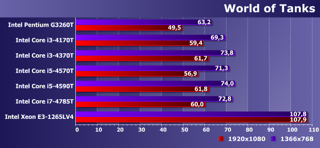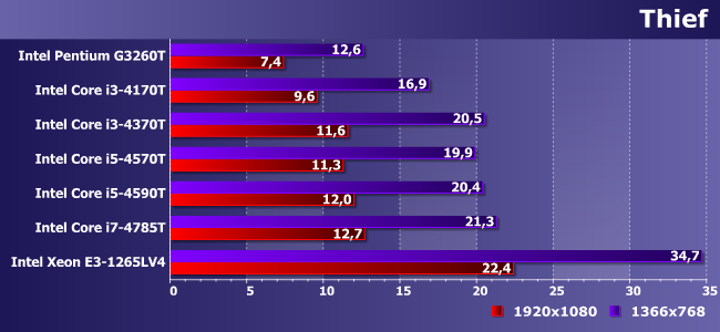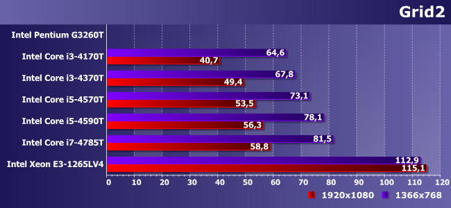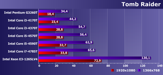 GT1 (т.е. графики Pentium и Celeron) просто мало, GT2 уже хватает на HD-разрешение (кстати, обратите внимание на то, как в данном случае различаются 4570Т и 4590Т, хотя GPU у них формально одинаковый), ну а GT3e в Xeon на Broadwell позволяет играть и при нормальном разрешении, да и для повышения качества картинки небольшой запас есть.