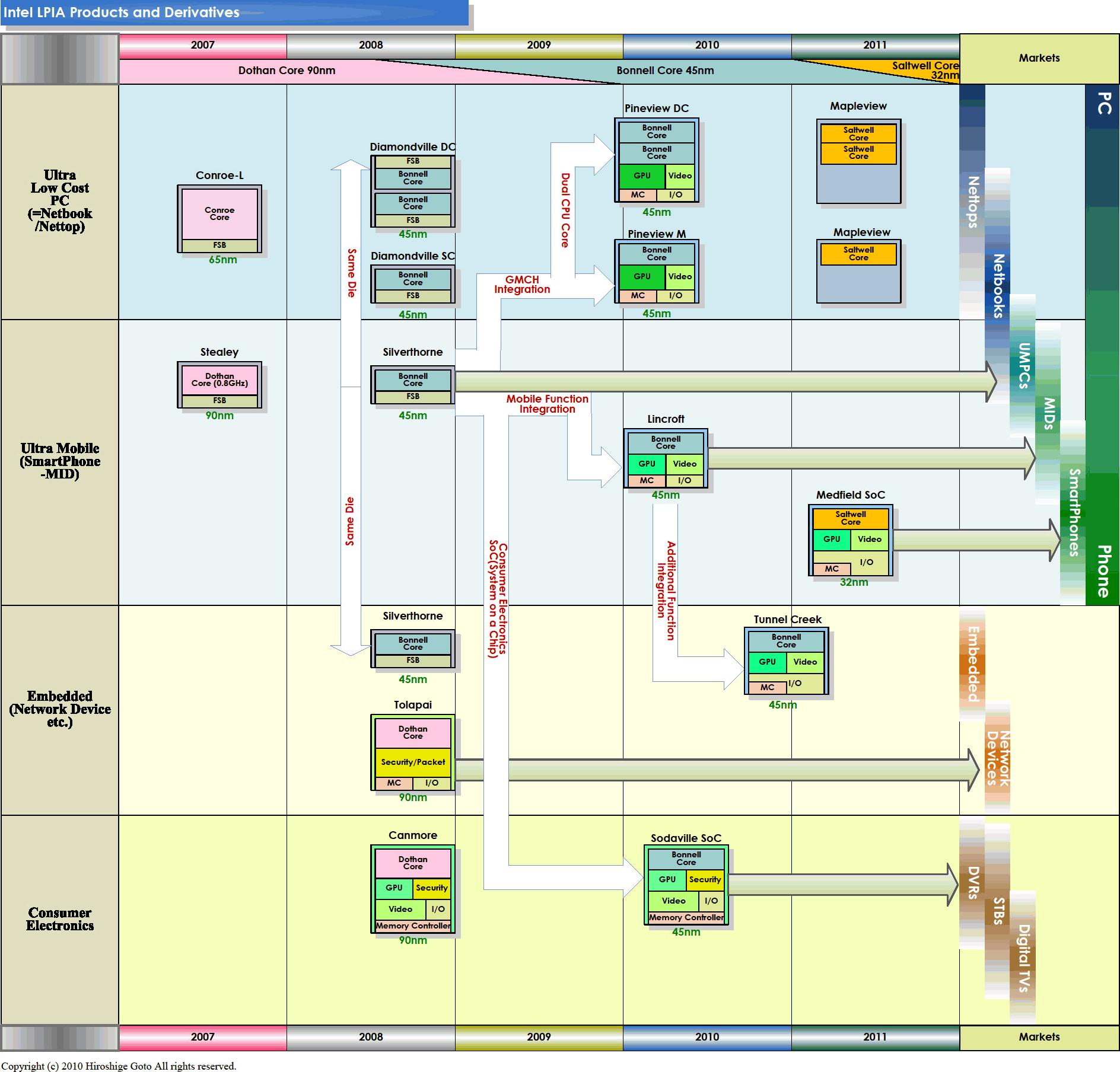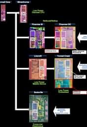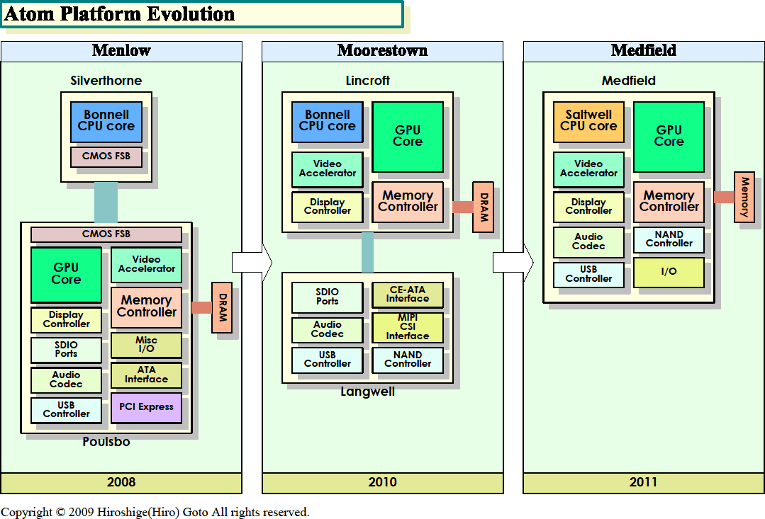 Если вы уже запутались в названиях и параметрах ядер и платформ — вот несколько шпаргалок, где также видно выходящее в 2011 г. третье 32-нанометровое поколение Атомов — Medfield с ядром ЦП Saltwell и встроенным южным мостом: