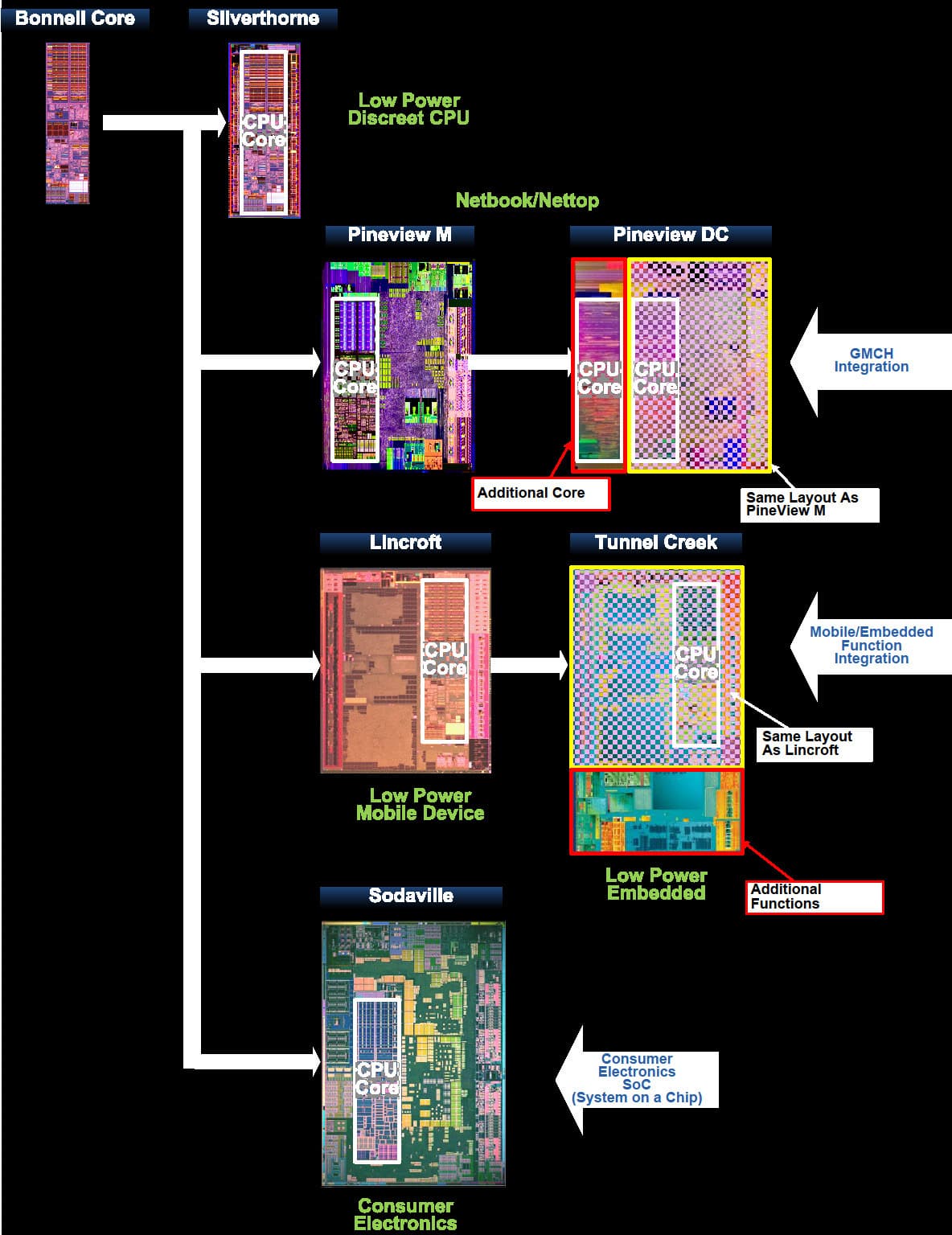 Чип Атома 400-х серий (Pineview) для платформы Pinetrail. Слева — ядро ЦП, справа — контроллер памяти, в центре — 3D/видеоядро, снизу — видеовыходы, сверху — остальные интерфейсы.
