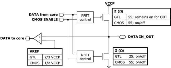Атом экономит ватты не только внутри ЦП, но и снаружи. Речь идёт не о чипсете, а о 64-битной шине FSB до него. Экономия достигается за счёт настраиваемого режима терминаторов — оконечной нагрузки шины, которая предотвращает «звон» и другие паразитные явления, мешающие повышению частоты и стабильности. При изготовлении чипа однократным пережиганием перемычки выбирается стандартный режим (обычная GTL) или экономный (КМОП). GTL (Gunning Transceiver Logic, передаточная логика Ганнинга) переключается между 0,4 В и 1,2 В, что куда меньше размаха стандартных логических уровней, но требует симметричной терминации, потребляющей драгоценные милливатты на каждом бите шины. В режиме КМОП-шины терминаторы отключаются, а входные компараторы настраиваются на меньший уровень лог. «1» относительно напряжения питания. Т. к. скоростных рекордов ставить не надо, этого достаточно для частот 400 и 533 МГц (для последних моделей, где северный мост ещё внешний — даже 667).
