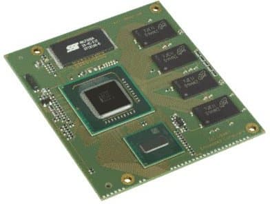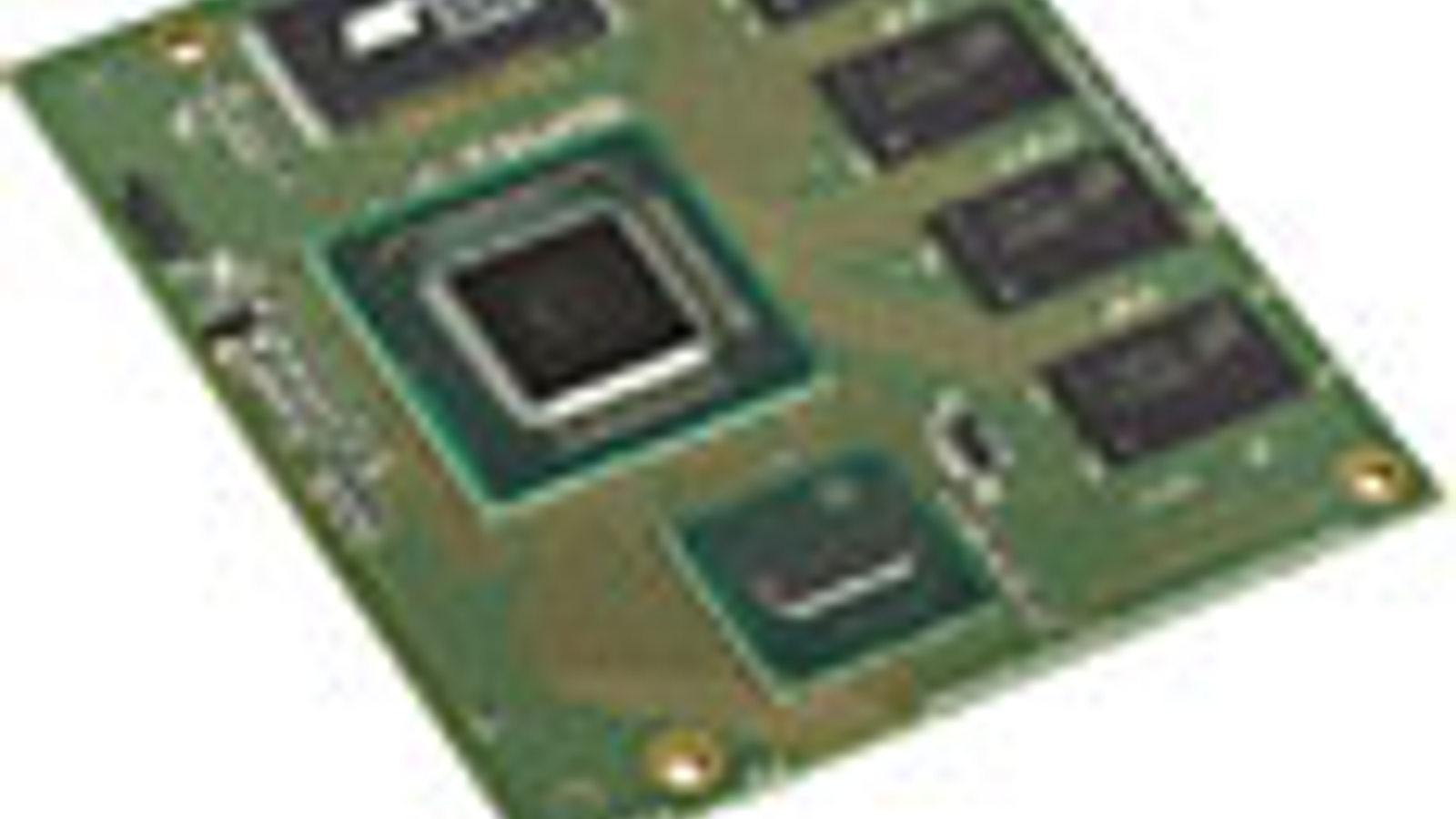 CoreExpress-Menlow — одна из первых плат на Атоме (внизу) и чипсете Poulsbo (в центре) размером 65×58 мм