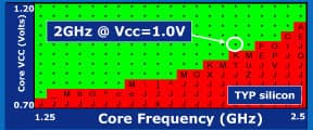 Результат неплох. По первоначальным предположениям младшим моделям для 1,3–1,5 ГГц хватит 0,8 В, для наиболее популярной частоты в 1,6 ГГц потребуется 0,85 В, а одного вольта хватило бы для 2,05 ГГц (если бы такая модель была). Цифры не такие уж и героические, ибо даже для настольных моделей куда более сложной архитектуры AMD K8 (при том, что она для экономии ватт совсем не предназначена), выполненных по последним степпингам предыдущего 65-нанометрового техпроцесса, отдельные чипы при 1 В питания работают на частоте 2,2–2,3 ГГц. Специально оптимизированная под энергосбережение версия 45-нанометрового техпроцесса могла бы дать простому Атому возможность повторить такое достижение в большинстве экземпляров. Но, в отличие от заявлений на слайдах, например, реальный Atom Z530 при частоте 1,6 ГГц питается от 1,213 В — и это специально отобранный для Z-подсерии особо экономный ЦП! «Настольная» модель 230 на той же частоте запитывается от 1,188 В… Atom N280, при простое снижая частоту с 1,66 до 1 ГГц, снижает напряжение до 1,063 В, а N450, интегрированный с северным мостом, — до 0,95.