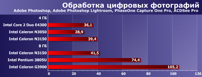 Эти программы вообще недолюбливают процесоры Atom со всеми вытекающими, а часть из них не слишком требовательна к количеству вычислительных ядер, но Celeron N3150 все равно быстрее Core 2 Duo E4300. Но не слишком — в отличие от нынешних Core, где сохраняет все тоже соотношение производительности: вдвое больше на каждый мегагерц. А если учесть, что и у ноутбучных процессоров тактовые частоты уже повыше, не говоря уже о настольных — итог предсказуем.