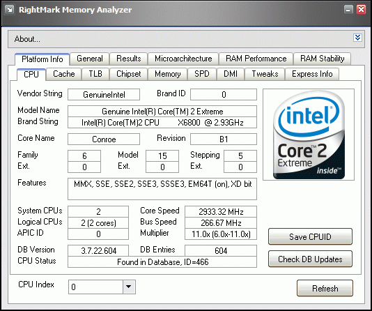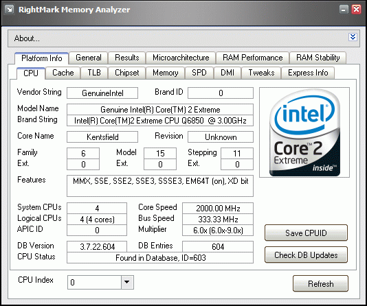 Рассматриваемый в этой статье процессор — Core 2 Extreme QX9770 — это ещё один CPU на ядре Yorkfield семейства Penryn, как и рассмотренный нами немного ранее Core 2 Extreme QX9650. Однако в отличие от QX9650, ни с одним из официально анонсированных чипсетов, включая Intel X38 Express, QX9770 работать (по крайней мере, официально) не может т.к. 1600 МГц FSB они не поддерживают. Поэтому его нам пришлось тестировать не на штатной для нашего тестового стенда LGA775-плате ASUS P5B Deluxe, а на инженерном сэмпле платы Gigabyte GA-X48-DQ6, базирующейся на чипсете X48 Express. Впрочем, по предварительным данным, X48 от X38 будет отличаться только одним, а именно: поддержкой 1600-мегагерцевой шины. Как и X38, X48 поддерживает два типа памяти: DDR2 и DDR3. Использованная нами плата имеет разъёмы только под DDR2, зато на её PCB гордо красуются надписи не только «DDRII-800», но и «DDRII-1066». Впрочем, именно для 1600-мегагерцевой шины использование DDR2-1066 вряд ли будет оправдано т.к. в этом случае шины памяти и процессора будут работать в асинхронном режиме. А вот DDR2-800 даёт практически идеальный вариант: частоты шин памяти и процессора равны, а ПСП двухканального контроллера DDR2-800 равна ПСП процессорной шины. Именно в этом режиме мы и проводили наши тесты.