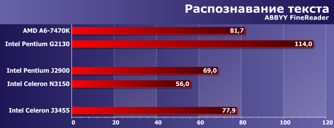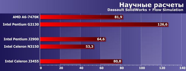 Задача на чистые вычисления, где, тем не менее, четыре «атомных» ядра все еще не могут полноценно конкурировать с двумя «взрослой» архитектуры — даже пятилетней давности. Да и всего один «двухполуядерный» модуль настольных моделей AMD не так уж плох. Во всяком случае, верно это было при его сравнении с Bay Trail и Braswell — новая суррогатная платформа Intel по меньшей мере не медленнее. С поправкой на количество поддерживаемых потоков вычисления, разумеется, но и требования по охлаждению у этих SoC совсем иные, нежели у «настоящих» настольных процессоров. И полуторакратное превосходство над J2900, который когда-то был лучшим в своем классе, у J3455, который уже не самый быстрый, но сравнимый с упомянутой моделью и по частотам, и по количеству ядер, говорит само за себя.