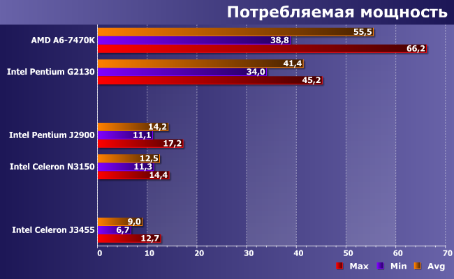 Нецелевое использование всех наших испытуемых, зато хорошо видно — кто как с расчетами справляется. Впрочем, ничего нового — старенький Pentium лидирует, а J3455 почти догоняет хотя бы одномодульные настольные процессоры AMD, существенно превосходя предшественников.