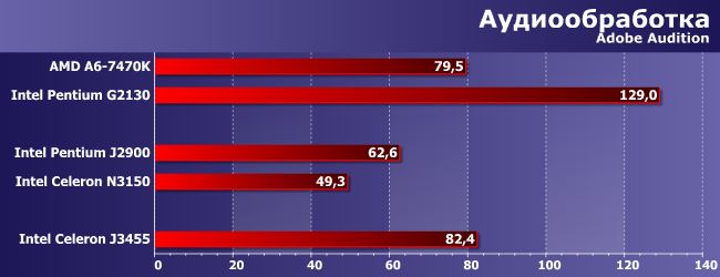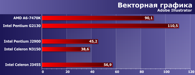 Эти приложения еще хуже относятся к представителям «атомных» платформ, да и хорошей утилизацией многопоточности не все из них похвастаться могут — соответственно, «настольные» процессоры (даже бюджетные и/или устаревшие) выглядят еще лучше, чем в предыдущем случае. Однако прирост производительности в своей нише тоже хорошо заметен: треть сравнительно с J2900 или полтора раза на фоне N3150. Тестируя топовые решения Intel мы такого давно не видели — но там и «расти» сложно. А вот «атомы», как видим, ускорять еще есть куда.