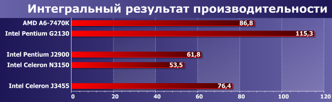 Старый код, как не раз уже было сказано, плохо относится к интенсивным методам повышения производительности, но неплохо реагирует на экстенсивные: количество ядер, их частоту и т. п. Несмотря на это J3455 сумел хоть на 15%, но обогнать J2900, а ведь ему это было и не обязательно: все-таки (если сравнить две платформы) позиционируется он на уровне J1900, который был еще медленнее.