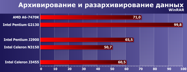 А вот и самая страшная часть нашей истории — несмотря на поддержку более быстрой памяти (частота 1866 МГц против всего 1333), Celeron J3455 «продул» Pentium J2900. Что, впрочем, может быть связано как раз с самой памятью — некоторые задержки могли и увеличиться, а к ним архиваторы более требовательны, чем к ПСП. Поэтому поставим галочку «и такое бывает», и перейдем к другим тестам.