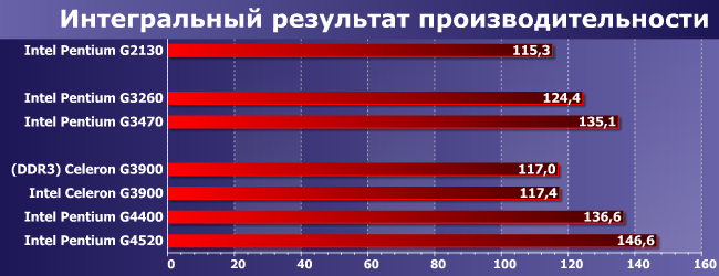 На иллюстрацию прогресса в бюджетном сегменте вполне сгодится — уже самый младший Celeron для LGA1151 обгоняет любые Pentium для LGA1155 (G2140 отличается от G2130 лишь 100 МГц тактовой частоты, т. е. буквально на 3%), а младшего Pentium для новой платформы достаточно для того, чтобы опередить любой Pentium уже для LGA1150. В общем, с каждой итерацией покупатель за те же деньги получает немного больше производительности, но не принципиально больше — как мы уже не раз писали, последней революцией были Celeron и Pentium как раз для LGA1155: дальше началось неторопливое эволюционное развитие. Во всяком случае, это касается процессорных ядер — о GPU разговор отдельный.