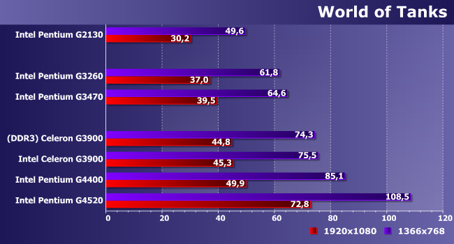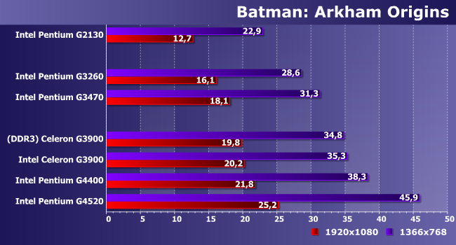 Итак, 2012 год — это Pentium G2130, A8-3870K (в середине года) и A8-5600K (в самом его конце). Тут, собственно, и сравнивать нечего :) Даже если взять A6, а то и А4, которые для этой игры тоже непригодны (раз уж существенно более новый и мощный А6-7400К этого не может), но все равно быстрее Pentium (да и не только) для LGA1155. Однако производительность G4520 в этой игре отличается от G2130 более чем в два раза, что позволяет процессору выйти на тот же уровень, что и A8-3870K. Впечатляющий результат, но сильно смазанный тем, что на дворе уже 2016 год, а не 2012, так что и процессоры AMD тоже «подросли»: пусть и не в два раза, но на треть — точно, так что A8-7670K, например, с данной игрой уже худо-бедно справляется и в Full HD. В общем, паритета как не было, так и нет. Но разница между соперниками сократилась, поскольку один из них двигался вперед интенсивнее. Причем и методы повышения производительности в запасе у компании тоже уже есть, так что их массовому распространению на рынке мешают лишь финансовые соображения, а не какие-либо технические трудности.