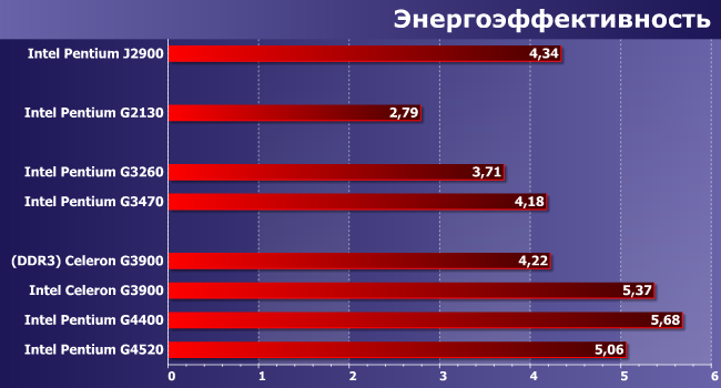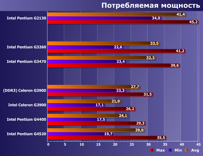 Собственно, вот зачем все затевалось — результаты Celeron G3900 с разными типами памяти отличаются примерно на 5-6 Вт. Заметим, что это один и тот же процессор, причем на очень похожих друг на друга платах, но такая вот разница. С учетом экономичности платформы — более чем заметная. Например, в итоге G4400 с DDR4 потребляет меньше энергии, чем G3900 с DDR3 (так что, пожалуй, придется и G4500T из предыдущей статьи еще разок перетестировать для большей корректности) при большей-то производительности.
