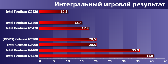 Собственно, ответ на вопрос — чем компания занималась последние несколько лет: «допиливала» GPU. Понятно, что основные силы были брошены на топовые решения, но и бюджетному сегменту немного, да доставалось, так что в плане «пригодности к играм» Pentium G4520 лучше, чем Pentium G2130 в четыре раза. Попутно также видно, что одинаковое видеоядро — еще не все: оно у G3900 и G4400 одинаковое, но первый ближе к старым бюджетным решениям компании, а второй не сильно отстает от G4520. Причина проста — кэш плюс тактовые частоты процессорных ядер уже имеют значение.