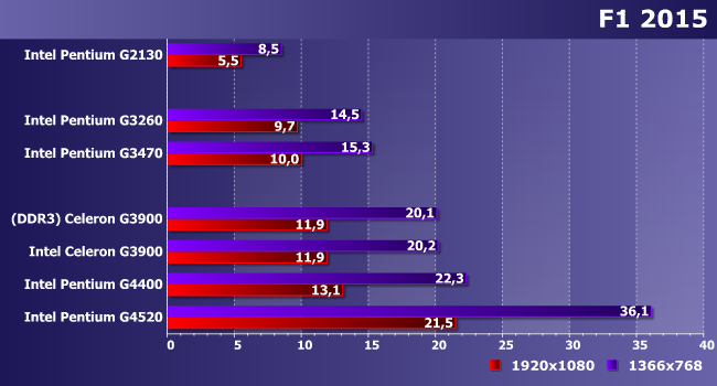 F1 2015 использует движок EGO 4.0, который (мягко говоря) тяжелее, чем 3.0 в Grid 2 и куче других автосимуляторов 2013-2014 годов издания. Но Pentium G4520 способен справиться и с ним — пусть только в HD-разрешении, однако для интегрированной графики и это неплохо (напомним, что A10-7800 при установке TDP 45 Вт быстрее лишь на ≈10%).